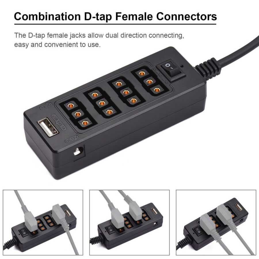 D-Tap Erkek ve Dişi Konnektör: 1'li D-tap erkek konnektör ve 4 kombinasyonlu D-tap dişi konnektör. D-tap dişi jaklar, çift yönlü bağlantıya izin verir, kullanımı kolay ve rahattır.