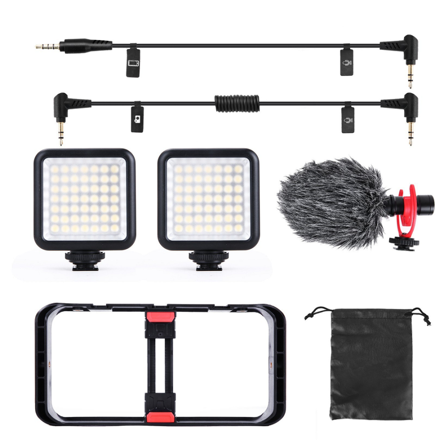 Akıllı Telefon için Video Rig Kiti Elde taşınan akıllı telefon kafesi, 2 adet mini LED ışık, ses kayıt mikrofonu ve mikrofon şoku montajı içeren video teçhizat kiti, akıllı telefon video kaydı ve canlı Akış, basit yapı ve esnek kullanım için tasarlanmıştır.
