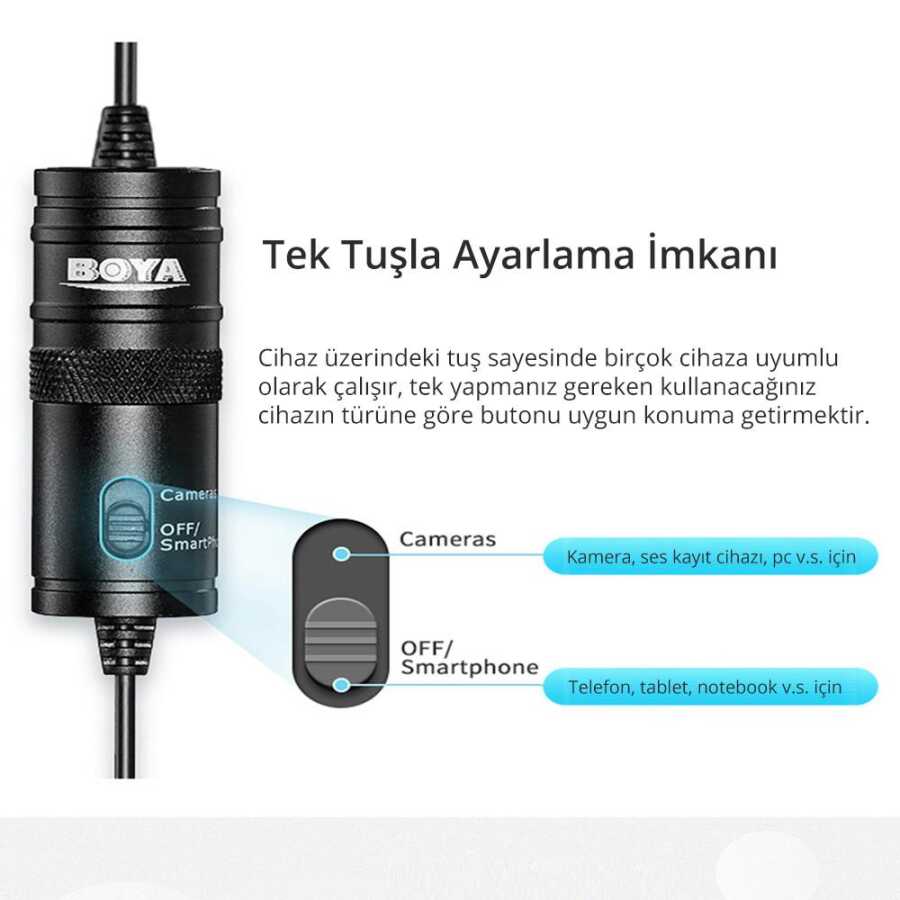 Boya BY-M1 telefon, tablet, fotoğraf makinesi, kamera, bilgisayar gibi birçok cihaz ile uyumlu yüksek kaliteli çok yönlü yaka mikrofonudur.