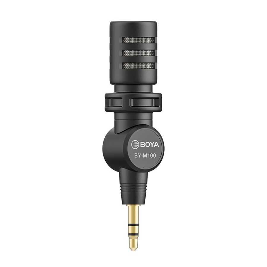 Boya BY-M100, DSLR fotoğraf makinesi, video kamera, ses kayıt cihazı gibi cihazlar için minyatür boyutta, çok yönlü 3.5mm TRS mikrofondur.