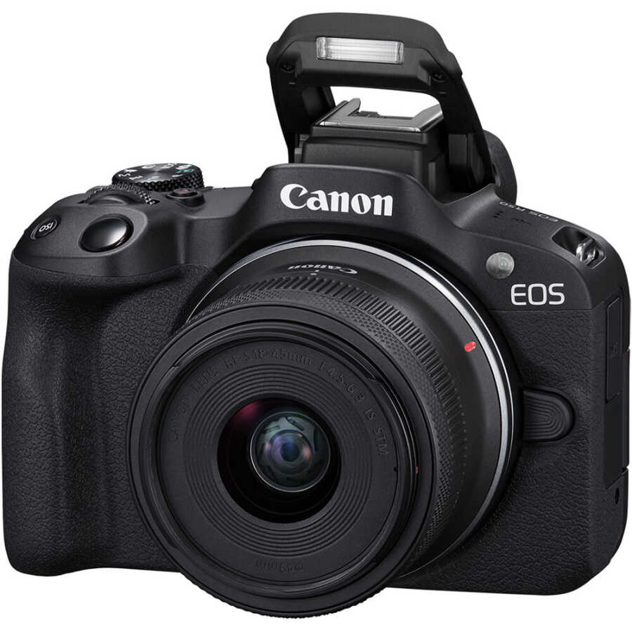 Gelişmiş bir kamera gövdesini çok yönlü bir lensle bir araya getiren 18-45mm Lensli Canon EOS R50 Aynasız Kamera , siyah multimedya aynasız kamerayı RF-S 18-45mm f/4.5-6.3 IS STM standart zoom lensiyle birleştirir.