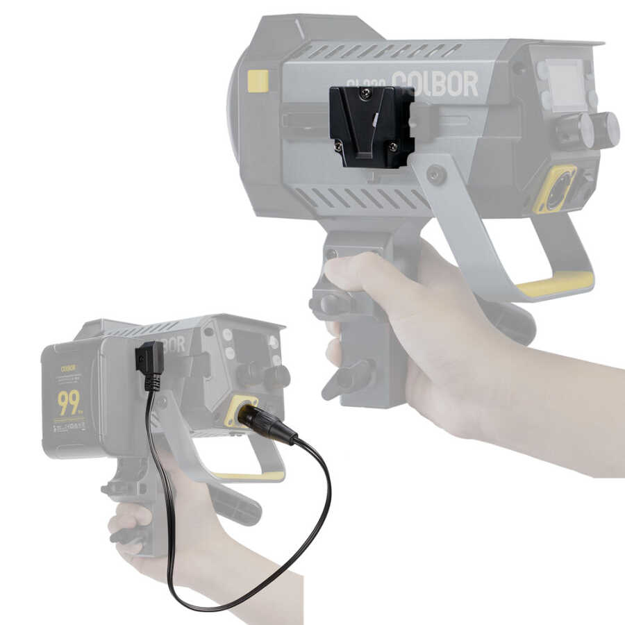 COLBOR V-Mount Adaptörü ve D-Tap'ten XLR V-Mount Pil Kablosu, V-Mount pillerin COLBOR CL220, CL220M, CL330 ve CL330M video ışıklarını çalıştırmasına olanak tanır. COLBOR 3.58" NATO uzatma çubuğu aracılığıyla monte edilmiş olacak şekilde tasarlanmıştır, bu çubuk standart olarak COLBOR CL220 ve CL330 serisi ışıklarla birlikte gelir.
