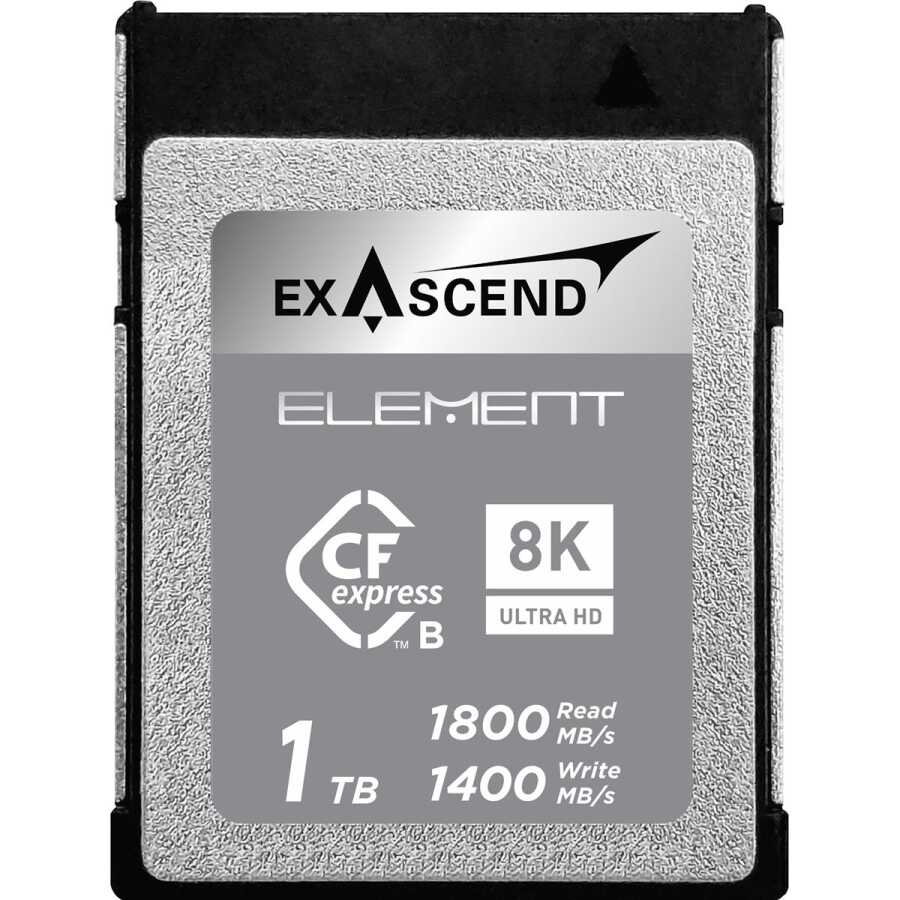 Fotoğrafçılık ve sinema meraklıları için optimize edilen Exascend'in 1 TB Element Serisi CFexpress Tip B Bellek Kartı, 8K ham ve seri fotoğrafçılık iş yüklerine ayak uyduracak şekilde tasarlanmıştır. Bu kart, 1 TB depolama kapasitesine, 3D TLC NAND flash belleğe sahiptir ve 1800 MB/s maksimum sürekli okuma hızına ve 1400 MB/s maksimum yazma hızına ulaşmak için PCIe 3.0 / NVMe 1.2 arayüzünü kullanır. Bu kart aynı zamanda 2 milyon saatlik MTBF, 600 TB Yazılan Toplam Bayt (TBW) derecesi, okunan 10 17 bit başına 1 sektörlük Kurtarılamaz Bit Hata Oranı (UBER) sunar ve 14 ila 158° arasındaki sıcaklıklara dayanıklıdır . F.