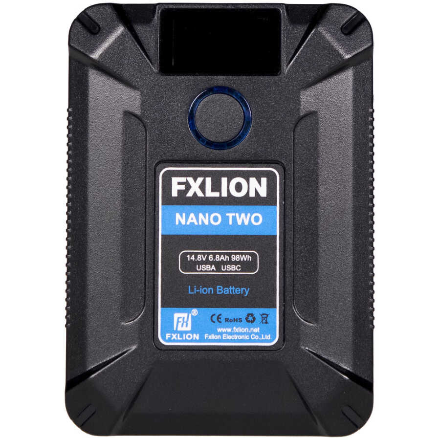 FXlion NANO TWO 98Wh 14,8V V-Mount Batarya, nominal 14,8V'ta 10A'e kadar çekişi destekleyebilen ultra kompakt, hafif bir 98Wh bataryadır. Çeşitli aksesuarlara veya mobil cihazlara güç sağlamak için bir adet 14,8V D-Tap dahil olmak üzere dört aksesuar bağlantı noktası sağlar. USB bağlantı noktaları arasında bir USB Tip-A çıkışı, bir USB Tip-C girişi/çıkışı ve bir mikro-USB girişi bulunur.