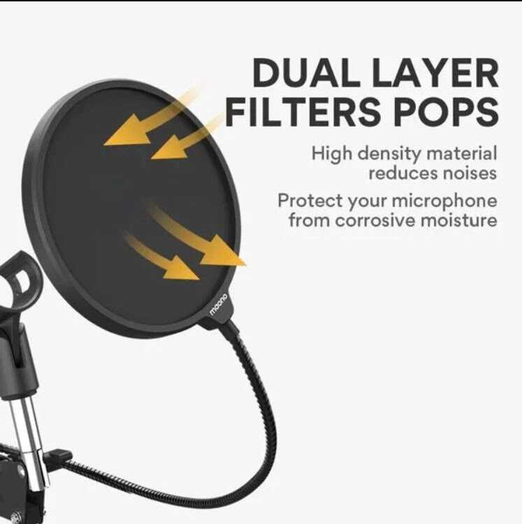 MAONO stüdyo mikrofonu ön camı, döner montajlı pop filtre maskesi kalkanı, kolay kurulum, sökme ve konum ayarlamayı amaçlamaktadır.