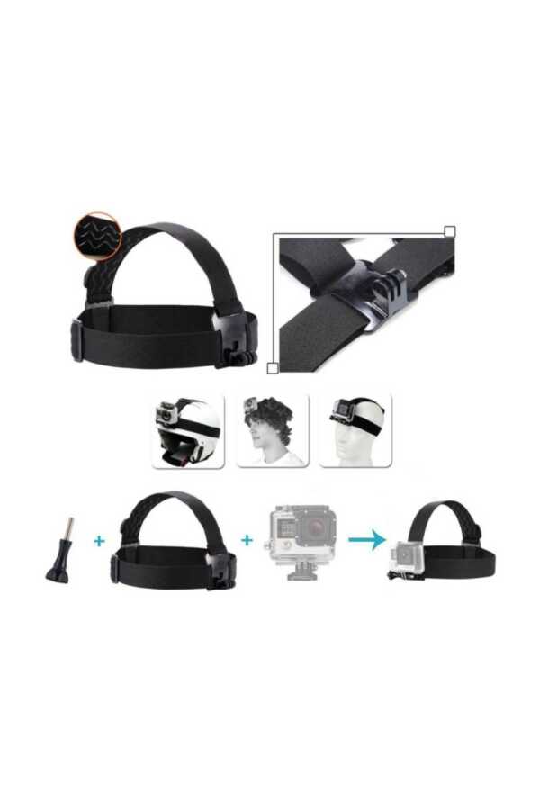 Dahil Olan Ana Parçalar: Büyük boy çanta, kafa bandı, göğüs bandı, vantuzlu tutucu, tripod adaptörü, J-Hook bağlantı parçası, 360 derece dönebilen bilek bandı, yüzen el aparatı, bisiklet gidon aparatı, çeşitli uzunluklarda vidalar.