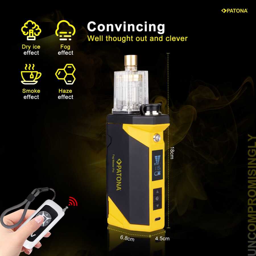 PATONA Fog Master Pro, fotoğraf ve video kayıtları için profesyonel bir taşınabilir duman makinesidir. Duman üretir ve böylece atmosferik etkiler ve özel ruh halleri yaratır, örneğin; mistik, dramatik ya da nostaljik. Kompakt tasarımı, hafifliği ve pille çalışması sayesinde dış mekan çekimlerinde, stüdyolarda ve diğer mekanlarda mobil kullanıma uygundur.