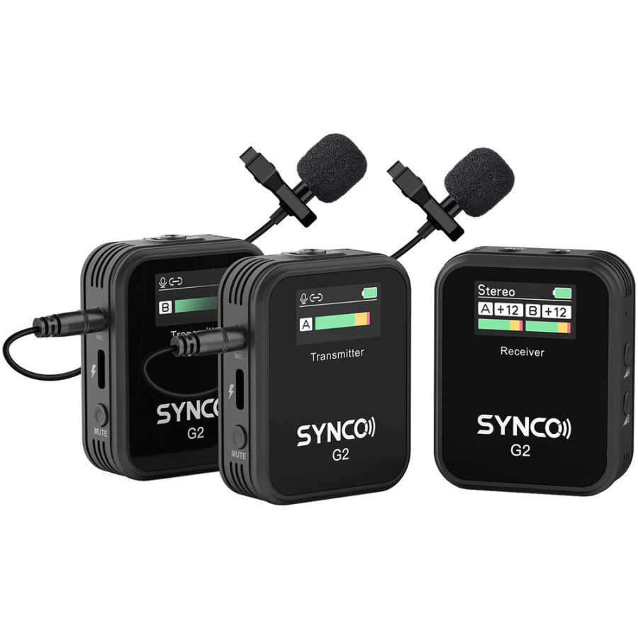 SYNCO G2(A2) çift kablosuz mikrofondur. Tüm ana göstergeleri gösteren bir ekrana sahiptir. Giriş sesini patentli teknoloji ile işler ve 2,4 GHz dijital iletim teknolojisine dayalı temiz, net ses gönderir. 1 alıcı ve 2 verici ile G2(A2) aynı anda iki ses kaynağını kaydeder ve çok çeşitli içerik oluşturma işlemlerine uygulanabilir.