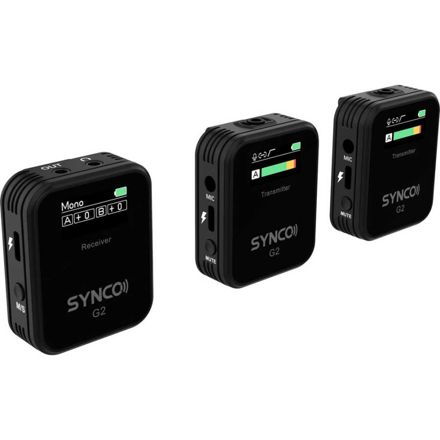 SYNCO ikili kablosuz mikrofon sistemi G2(A2), diğer vericinin 2 kişilik diyaloğun kaydını ve çıkış modlarının esnekliğini sağlamasıyla kendisini G2(A1)'den ayırır ve G1(A2)'den gerçek renkle farklılık gösterir. Kayıt modu ve pil durumu gibi her bir önemli rakamı farklı ışık yoğunluklarında okunabilir hale getirmek için hem vericide hem de alıcıda TFT ekranına sahiptir.