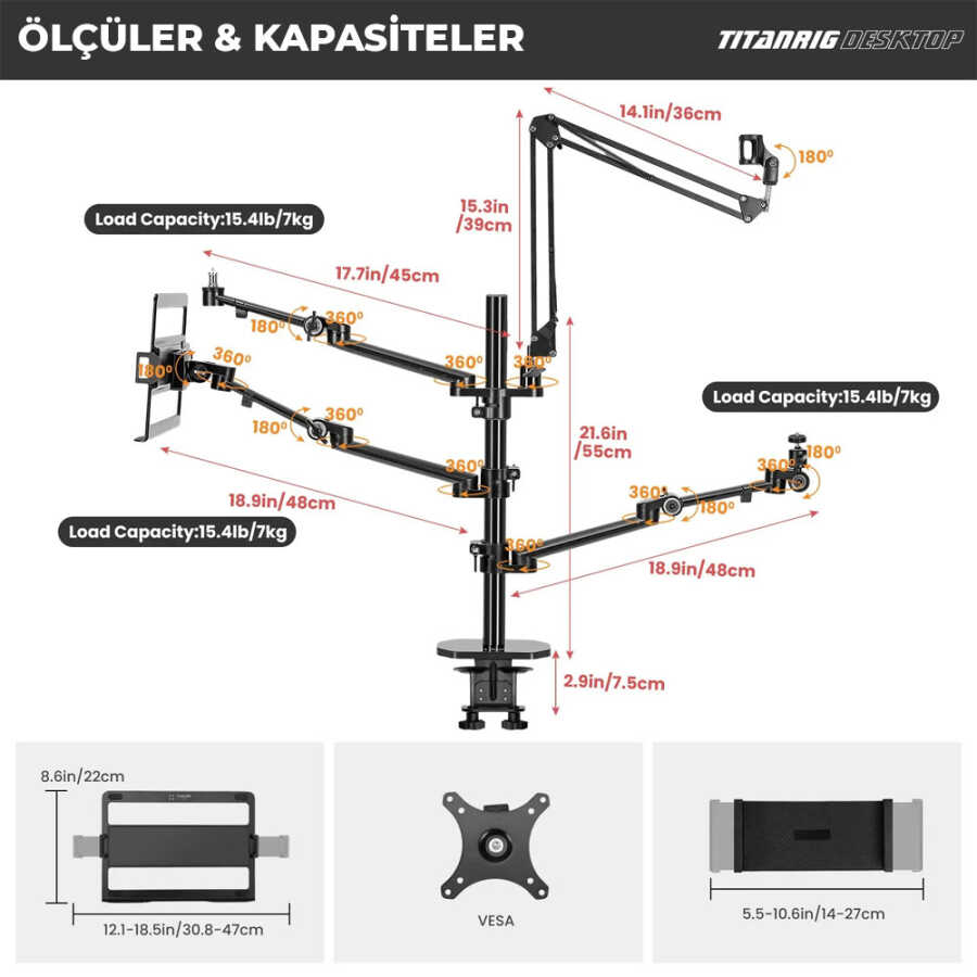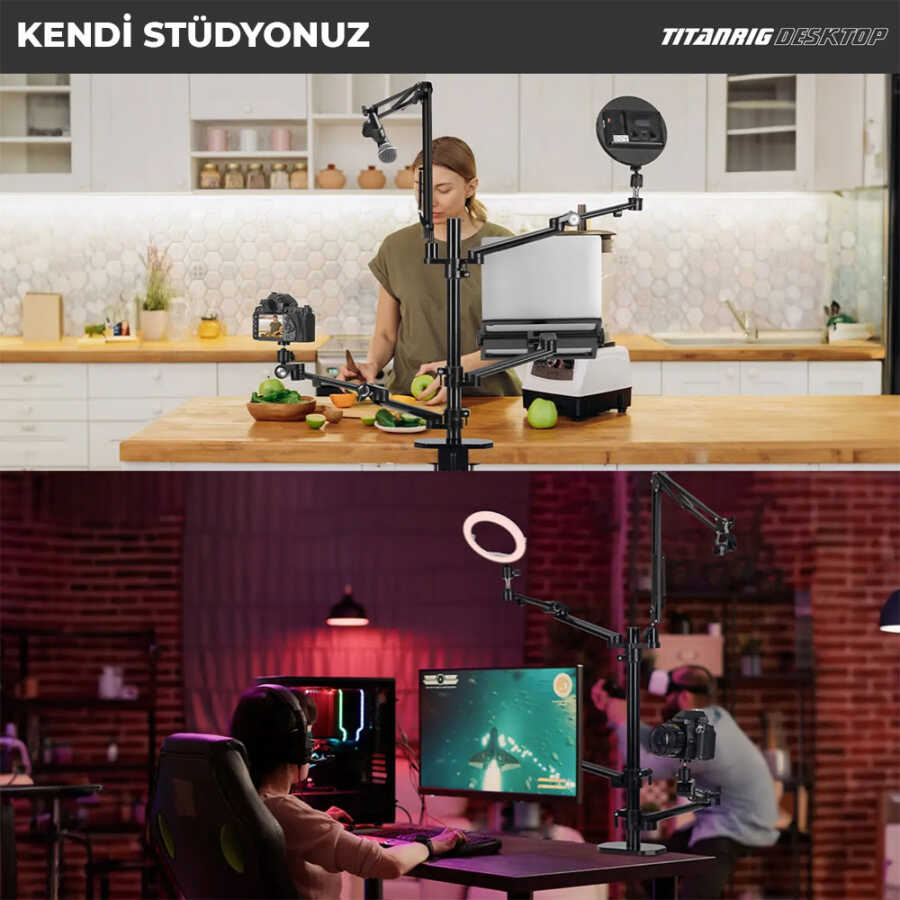 Tarion Titanrig Desktop Set; kamera, mikrofon, monitör, ışık ve laptop gibi ekipmanlarınızı tek bir ana gövde üzerinde toplayan, profesyonel yayıncılar ve içerik üreticileri için tasarlanmış devrim niteliğinde bir masaüstü çözümüdür. "C-Clamp" (Mengene) sistemi ile masanıza sıfır yer kaybıyla monte edilir, size geniş ve düzenli bir çalışma alanı bırakır.