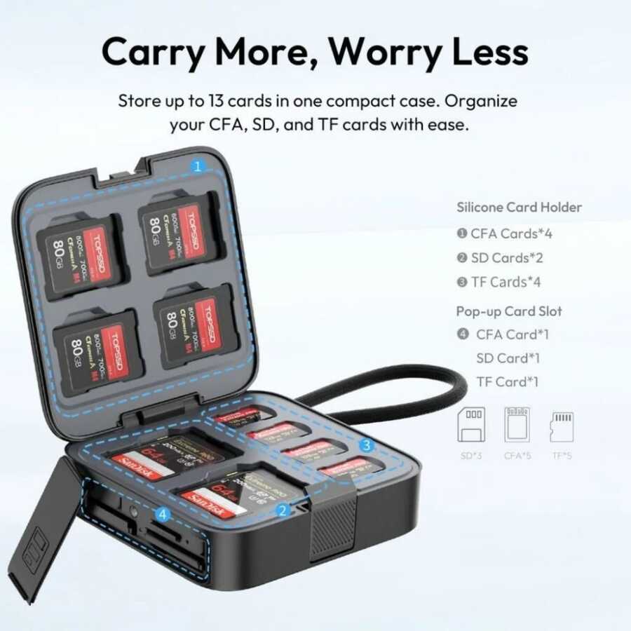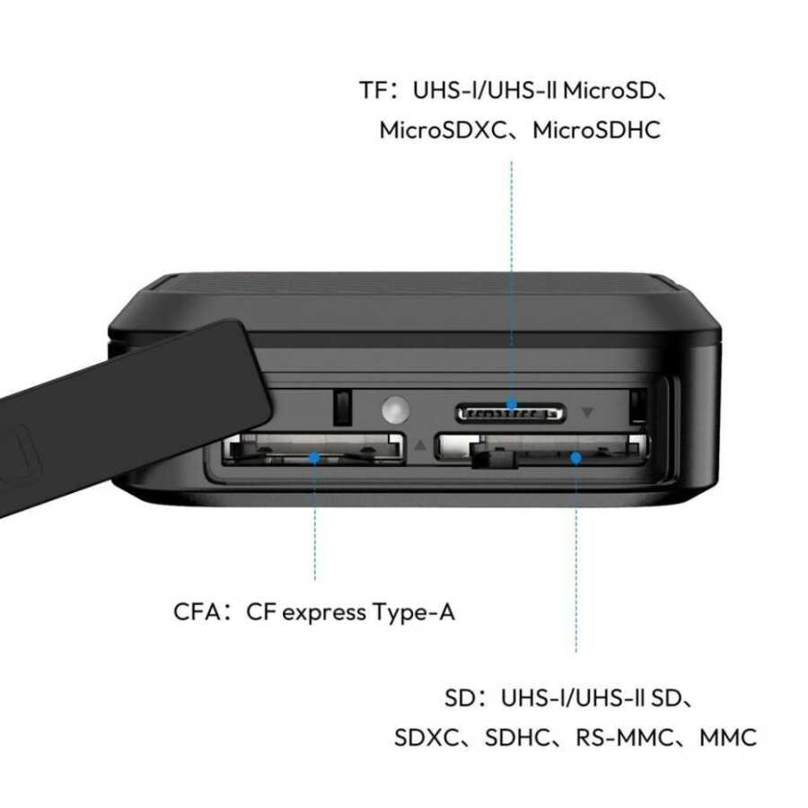 Ulanzi CRC10 3-in-1 Kart Okuyucu Kılıfı, CFexpress Type A, SD ve microSD kartları için hem depolama hem de okuma işlevi sunar. Entegre 10 Gbps USB 3.2 Gen 2 arayüzü sayesinde hızlı veri transferi sağlar. Alüminyum alaşım dış yüzeyi, etkin ısı dağılımı sunar.