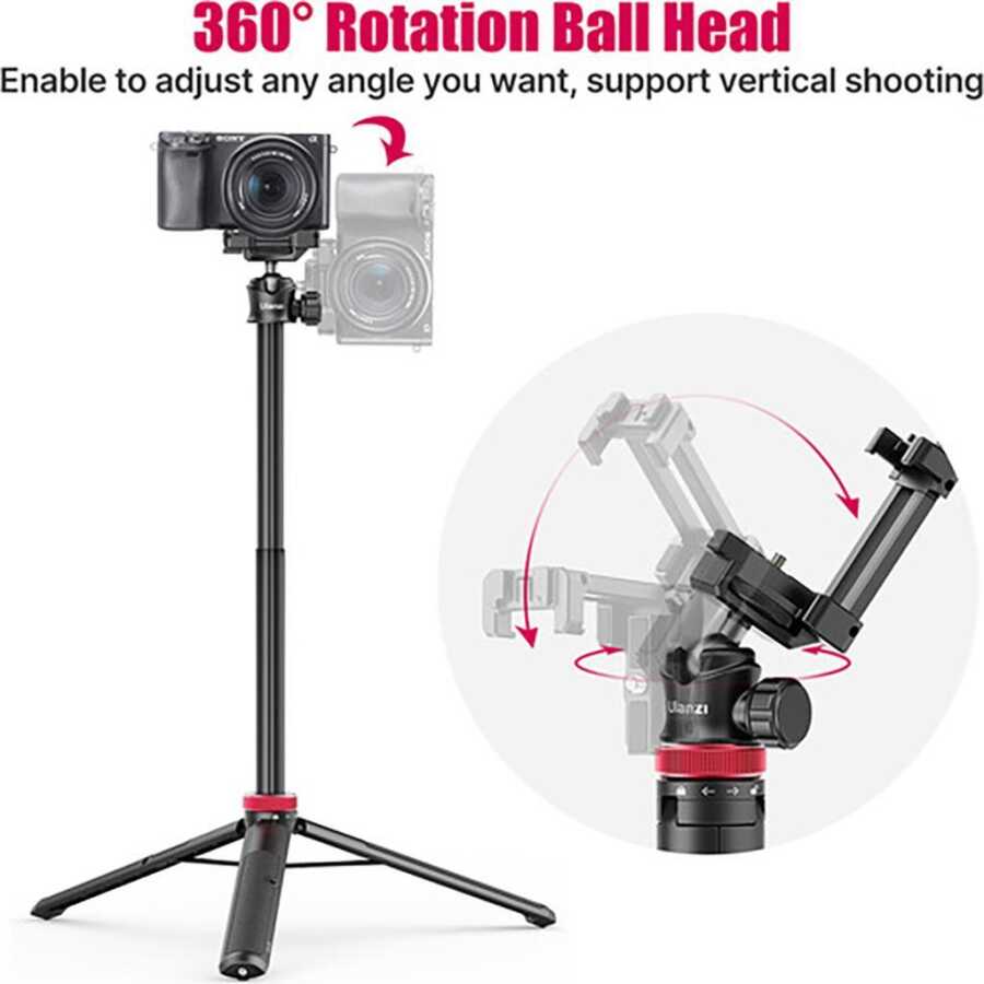 Ulanzi MT-44 Uzatılabilir Vlog Tripod, ball head başlığı ve ek aksesuar yuvaları sayesinde video blog içerikleri üretebilmeniz için tasarlanmıştır. Ulanzi'nin MT-44 Uzatılabilir Vlog Tripod'u, kompakt kameralar ve akıllı telefonlar için mini tripod veya selfie çubuğu olarak kullanılabilir. Alt tutamak, tripod tabanı olarak işlev görmek üzere açılır. Üstteki kamera montajı, standart 1/4" montaj vidalı bir kamera platformundan ayarlanabilir bir akıllı telefon tutucusuna dönüşür. Kamera montajı, 360° dönme ve 90° eğme ayarı sunan bir ball headin üzerine oturur, kameranızı veya telefonunuzu yatay veya dikey modlarda ayarlamanıza olanak tanır.