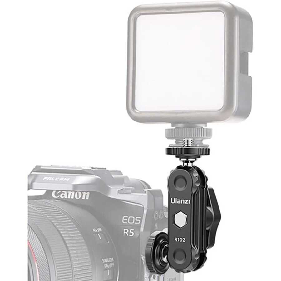 Ulanzi R102 çift oynar başlıklı kolu; sahip olduğu 1/4" vida girişleri sayesinde herhangi bir monitörü, dolgu ışığı veya mikrofonu cihazlarınıza monte edip dilediğinizce ayarlama yapabilmenize olanak tanır. Toplam uzunluğu 3,5" olan bu sihirli kol, 180° eğilebilen ve 360° döndürülebilen iki bilye başlığına sahiptir . Her bir top kafa, seçtiğiniz uyumlu aksesuarları takmak ve kolu kamera kafesine monte etmek için 1/4" vidaya sahiptir. Toplam 1 kg yük kapasitesi ile harici monitör, shotgun mikrofon ve dolgu ışığı gibi çok çeşitli aksesuarları destekler.