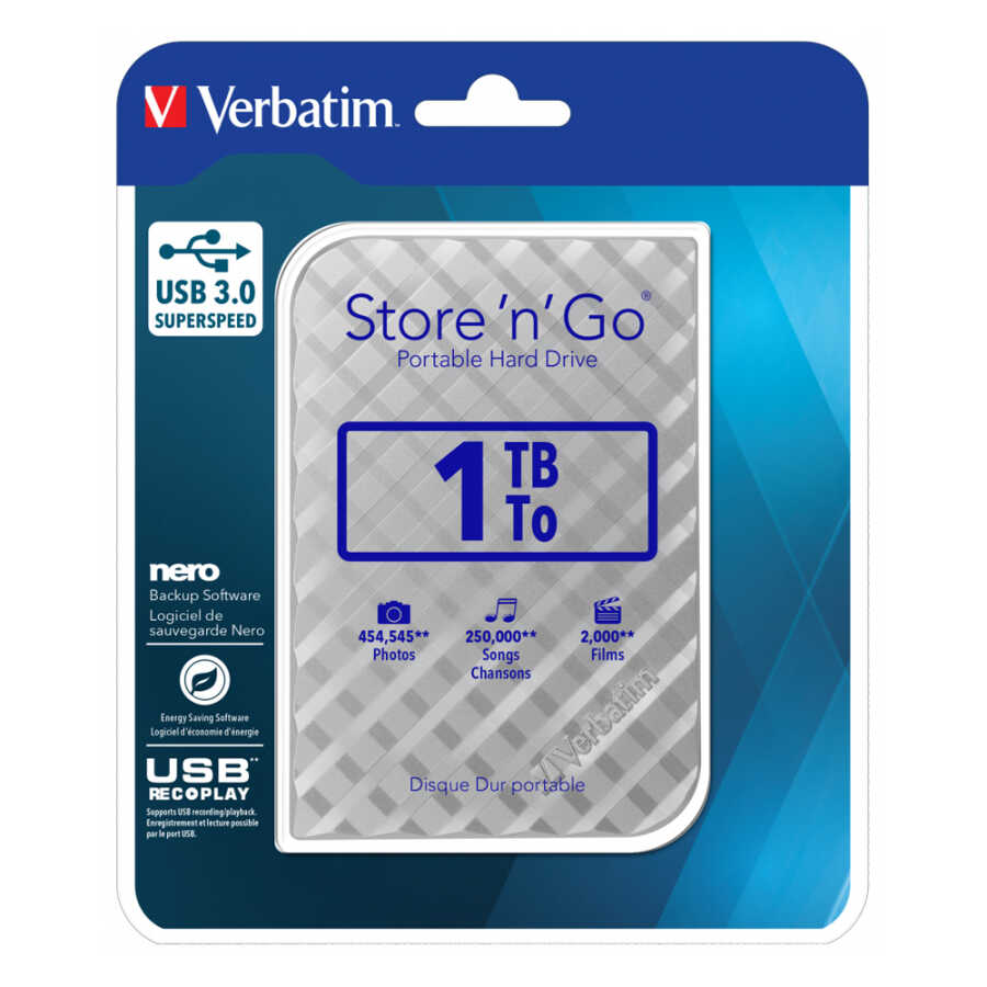 Verbatim Store n Go taşınabilir sabit sürücü, USB 3.0 “Süper Hızlı” arayüz kullanarak yüksek performanslı depolama sağlar. USB veri yolu hızı temel alındığında USB 3.0, USB 2.0'dan 10 kat daha yüksek veri aktarım hızı sunarak ihtiyaç duyulduğu anda çok hızlı veri aktarımı sağlar.