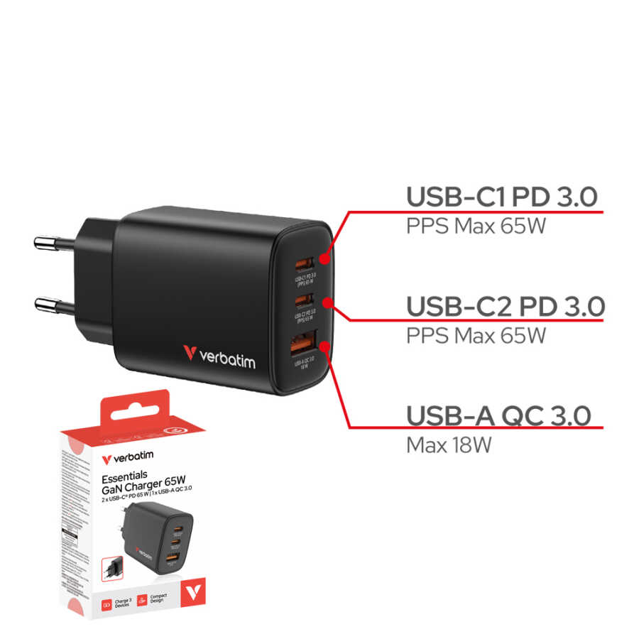 Verbatim Essentials GaN 65W Şarj Adaptörü 3-Port - Siyah (32352)